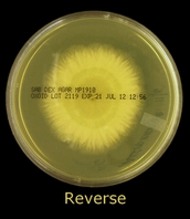 Gliocladiumexhibits rapid growth, maturing within 4 to 5 days. Surface growth is white to cream at first but quickly develops various shades of green. The outer fringe may remain white. Some strains may also exhibit pink colouration on the surface. Surface texture has been described as cottony to woolly. Reverse is unremarkable, pale or slightly yellow in colour.