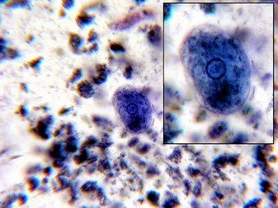 This specimen contained both E.polecki trophs and E.hartmanni trophs. Note the size difference.
