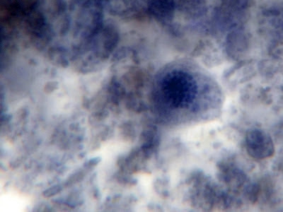 The parasite show below is possibly an Entamoeba coli, however the nucleus is not visible as it is out of the plane of focus. Sphaerita appears as the small dots within the cytoplasm.