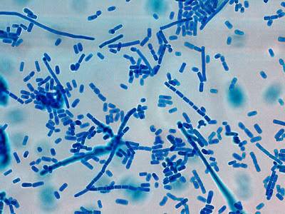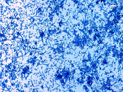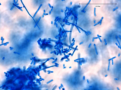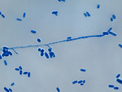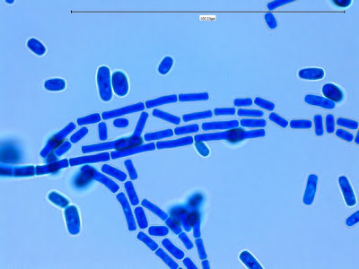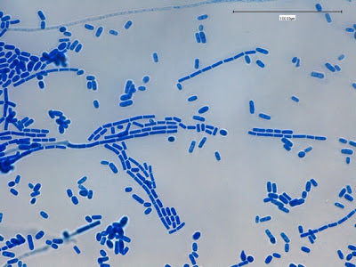 Geotrichum candidum showing hyphae, arthroconidia in chains and individual arthroconidia from the fragmentation of the chains (X400) LPCB