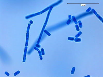 Geotrichum candidum - individual arthroconidia. Some of the arthroconidia appear as cylindrical with rounded ends. Some arthroconidia look somewhat barrel-shaped with some variation in size. Unsure of the round cell near the middle (X1000+10) LPCB