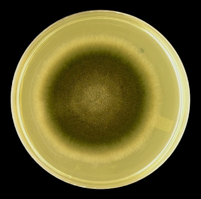 Surface growth is grey in colour, quickly darkening with the production of melanin, eventually developing shades from olive to brown to black.