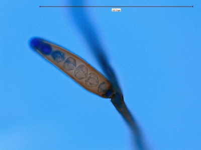 Exserohilum rostratum - okay, I like photos! Another loose conidium which is slightly bent. This one has seven, possibly eight compartments. The conidium is smooth walled and again, the hilum is clearly visible at one end. (1000X, LPCB, DMD-108)