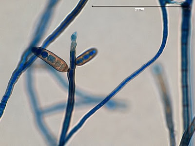 Exserohilum rostratum -Conidia attached to septate hyphae (400X, LPCB, Nikon)
